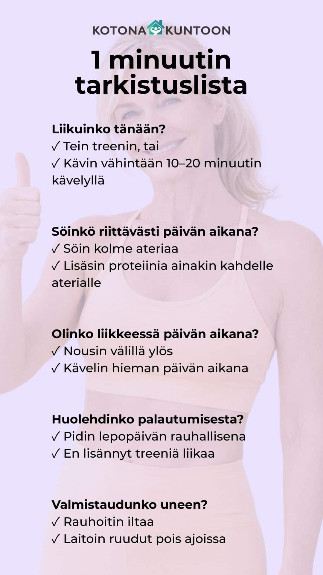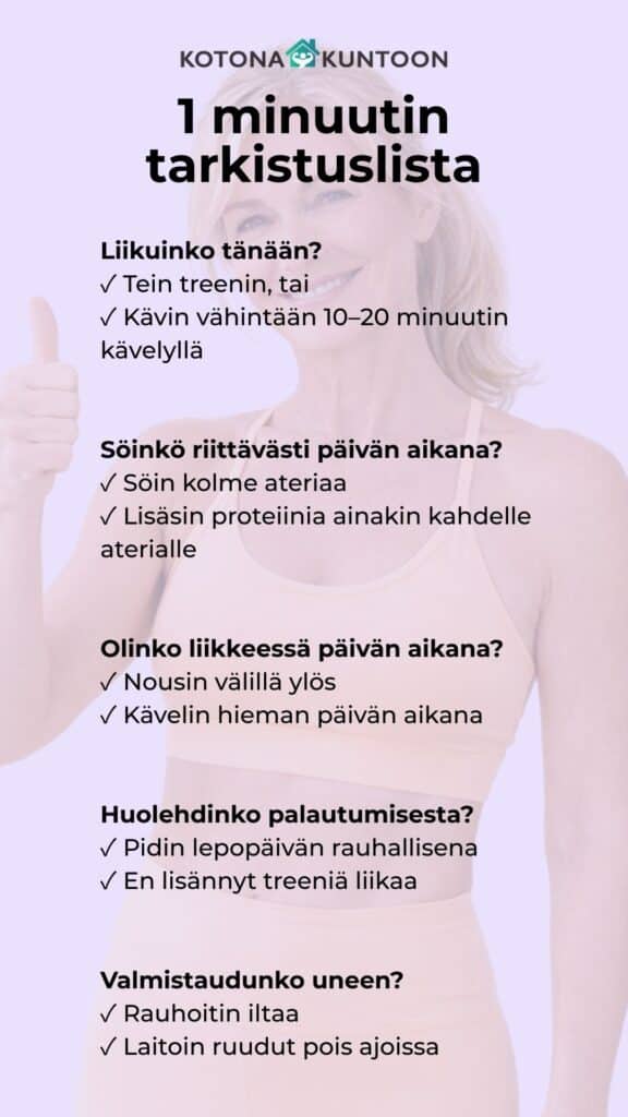 ✅ Lisää päivään yksi tarkoituksellinen liikehetki, vaikka treeniä ei ole. Esimerkiksi lyhyt iltakävely, muutama liikkuvuusliike aamulla tai venyttely tv:tä katsoessa.