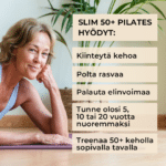 Slim 50+ Pilates on 4 viikon tarkoin laadittu treeniohjelma, jossa tavoitteena on polttaa rasvaa ja kiinteyttää kehoa.