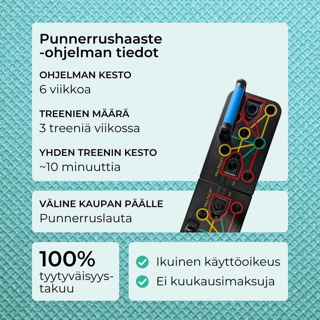 Takuumme on, että saat parannettua punnerrustulostasi vähintään 20:llä punnerruksella, mutta monilla on siinä sivussa saanut kipinän treenata muitakin lajeja ja vyötärö on kaventunut.