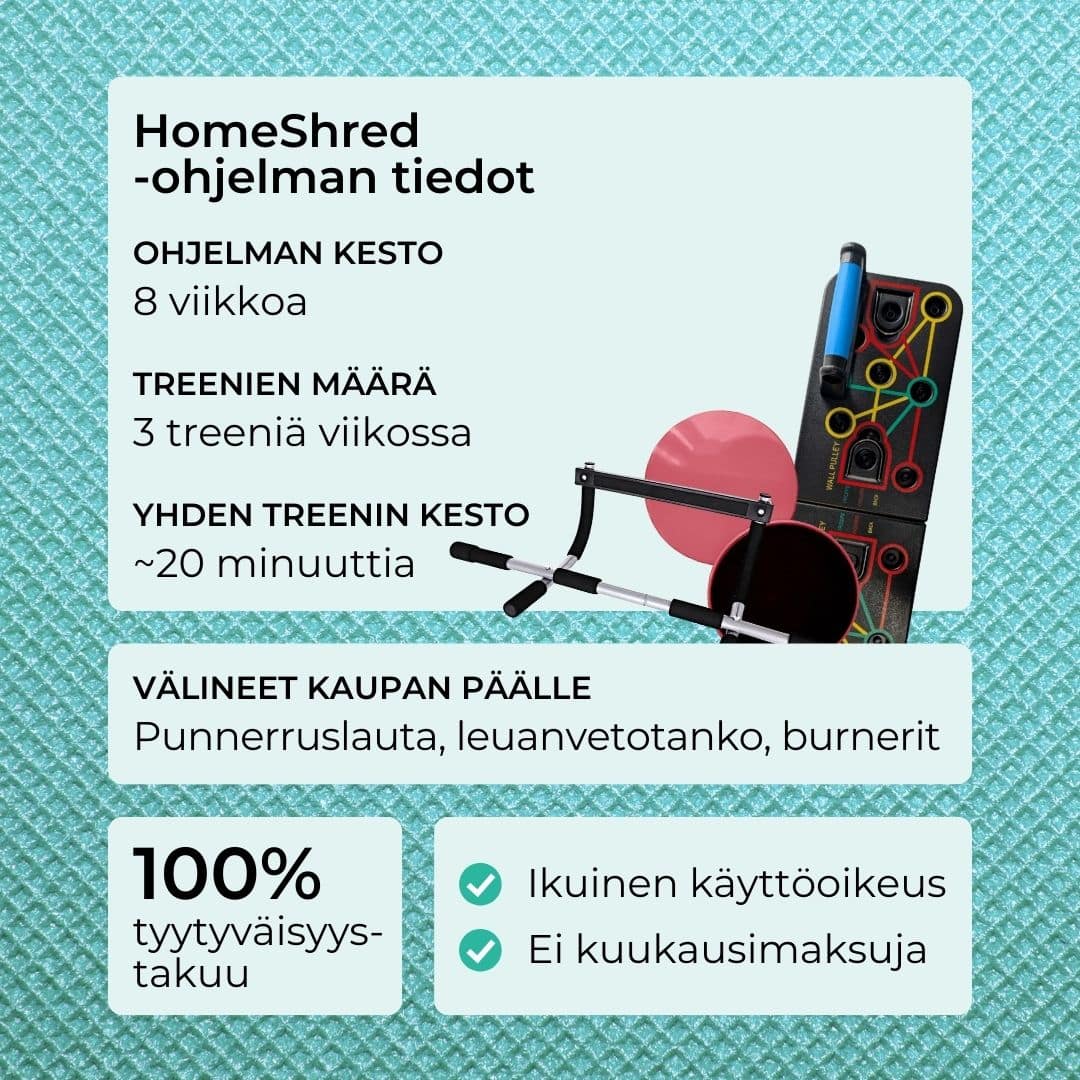 HomeShred-treeniohjelman avulla saat lisää kokoa sekä rintaan että selkään, lisäsenttejä hauiksiin ja olkapäihin sekä tiukan vatsan. Tilatessasi harjoitusohjelman saat kaupan päälle punnerruslaudan, leuanvetotangon sekä CoreBurnerit.