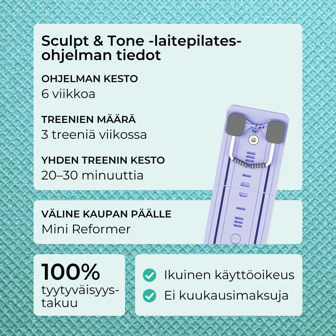 Sculpt & Tone on 6 viikon laitepilatesohjelma, joka muokkaa kehoa pilatekselle tyypillisellä tavalla: kiinteämmäksi, linjakkaammaksi ja hallitummaksi.